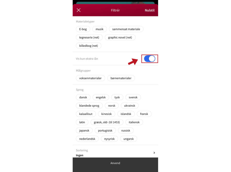 Når du søger efter en titel i eReolens app, kan du indsnævre søgeresultaterne til udelukkende at vise titler, der er "ekstra lån".